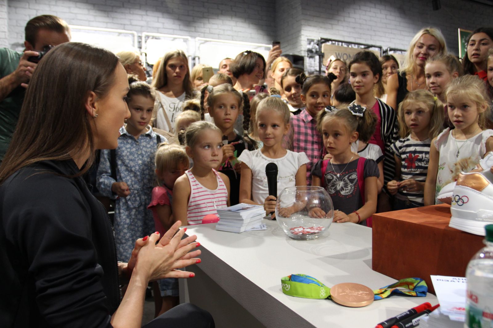 Согласно плану мероприятия, сначала Аня отвечала на вопросы. Задать их мог каждый. В основном, спрашивали стандартные вещи вроде «останешься ли ты до Игр в Токио?», «какие твои впечатления от Олимпиады?» или «какой твой любимый предмет?». Спортсменка пообещала, что останется ещё на год точно, а насчёт Токио она пока не загадывает, хотя хотела бы там выступить. Хорошей новостью для украинских болельщиков стало сообщение о том, что в следующем году в Киеве снова пройдет Кубок Дерюгиной. Само собой, Анна Ризатдинова уже вчера подтвердила свое участие.