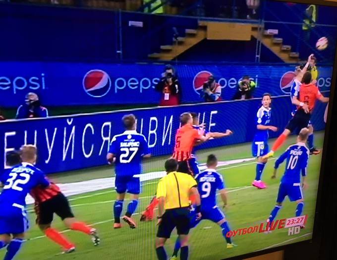 Срна підставив руку під м'яч, що після удару... не після пасу, навісу відскоку, зрізки, а після удару прямісінько в ворота . після чого впав, як підкошений, схопившись за обличчя