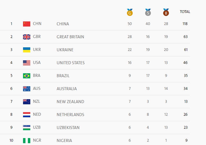 После пяти соревновательных дней в копилке нашей сборной уже 61 медаль – 22 золотых, 19 серебряных и 20 бронзовых. Сборная Украины занимает третье общекомандное место в медальном рейтинге, уступая только Китаю (50+40+28) и Великобритании (28+16+19).