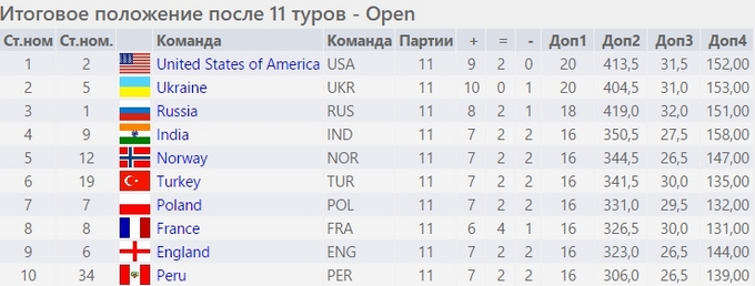 В последнем туре мужчины обыграли Словению со счетом 3,5:0,5. Американцы, с которыми украинцы сражались за золото, одолели Канаду 2,5:1,5. Итоге, обе команды набрали по 20 очков, но из-за разницы в дополнительных показателях золотые медали достались США. «Бронза» у сборной России.