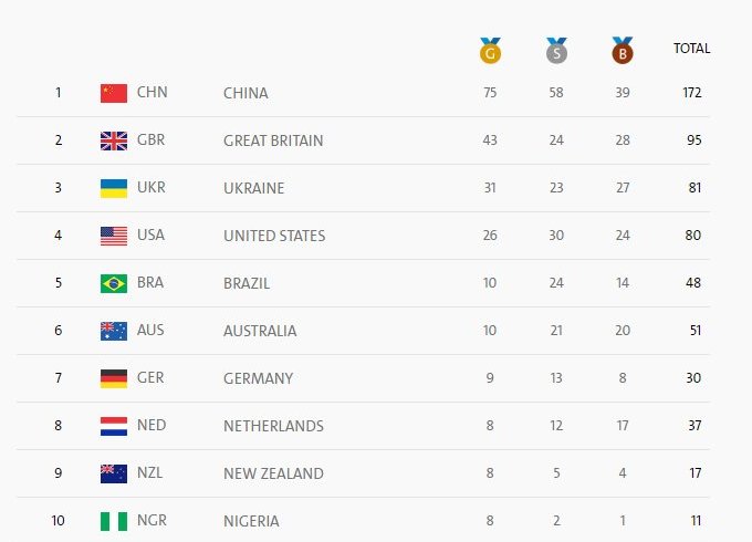Лидировать в рейтинге продолжает Китай с фантастическим показателем в 172 медали (75+58+39). Второе место и 95 медалей у сборной Великобритании (43+24+28).