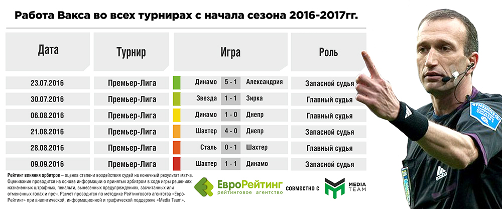 Евро-Рейтинг отмечает уверенную работу Юрия Вакса в чемпионате Украины. Рейтинговая оценка влияния по итогам первых семи туров – 2,58 баллов (степень влияния на результат матча – «ниже средней»). Этот показатель входит в тройку лучших оценок арбитров в нынешнем первенстве.