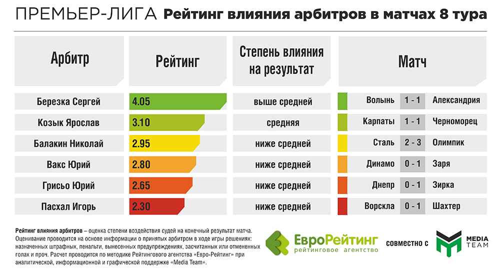 Также качественно отработали в сложны матчах Вакс и Пасхал. В результате, в рейтинге влияния арбитров произошли некоторые изменения. В частности, Игорь Пасхал покинул неприятную пятую позицию в списке наиболее «влиятельных» арбитров, поменявшись местами с