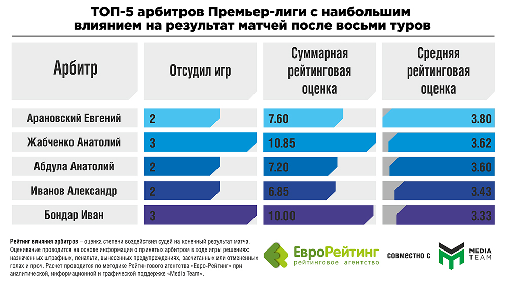 Рейтинг влияния арбитров – оценка степени воздействия судей на конечный результат матча. Оценивание проводится на основе информации о принятых арбитром в ходе игры решениях: назначенных штрафных, пенальти, вынесенных предупреждениях, засчитанных или отмененных голах и проч.