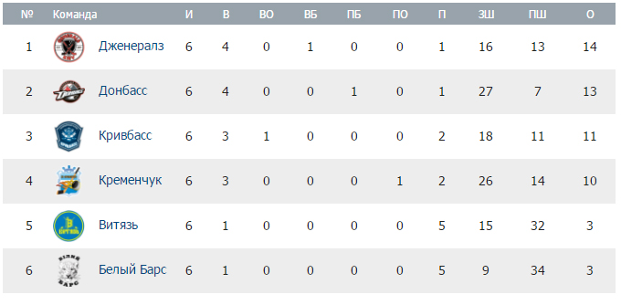 После шестого тура Украинской хоккейной лиги в таблице обозначился едионличный лидер - им стал киевский клуб «Дженералз», по буллитам обыгравший «Донбасс».