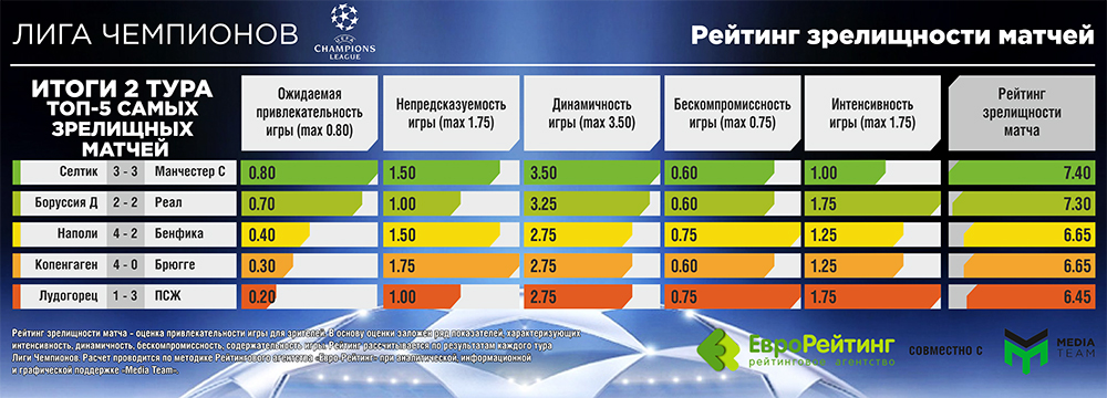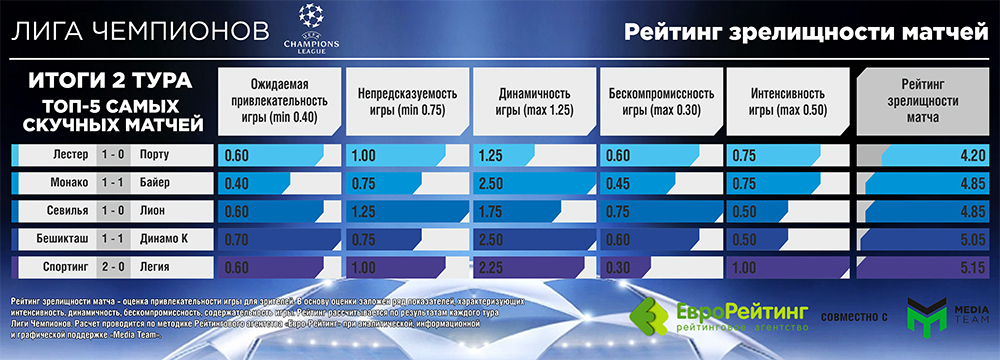 Рейтинг зрелищности матча – оценка привлекательности игры для зрителей. В основу оценки заложено ряд показателей, характеризующих интенсивность, динамичность, безкопромисность, содержательность игры. Информация о подходах к расчету: на сайтах Рейтингового агентства «Евро-Рейтинг» и Media Team.