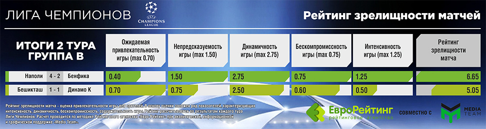 Вообще в группе В сложилась любопытная ситуация. Если в игре участвует Бешикташ, она попадает в ТОП-5 худших. Наполи и его соперник демонстрируют зрелищный футбол. Динамо и Бенфика пока не являются законодателями моды на зрелищность.