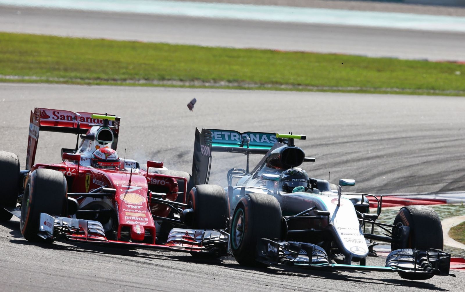 А от Росбергу в Малайзії пощастило, причому кілька разів і справа навіть не в сході єдиного конкурента в боротьбі за титул. Ніко побував у двох зіткненнях з машинами Феррарі і якщо в першому повороті його вини і близько не було, та він відбувся лише розворотом – все-таки задня підвіска машин набагато міцніша і, як виявилося, здатна витримати сильний удар. Вдруге Ніко пощастило тоді коли він на 39-му колі вирішив обганяти Ряйкконена у другому повороті, де місця для двох машин не вистачало. Знову зіткнення і знову Мерседес постраждав мінімально: