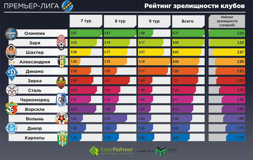 Вторым клубом в рейтинге оказалась луганская Заря. Две качественные победы над Ворсклой и Динамо, яркая ничья со Сталью обеспечили клубу высокую среднюю оценку в рейтинге зрелищности – 3,20 баллов. Для того, чтобы оказаться выше Олимпика этого было недостаточно. Но чтобы опередить Шахтер, вполне хватило.