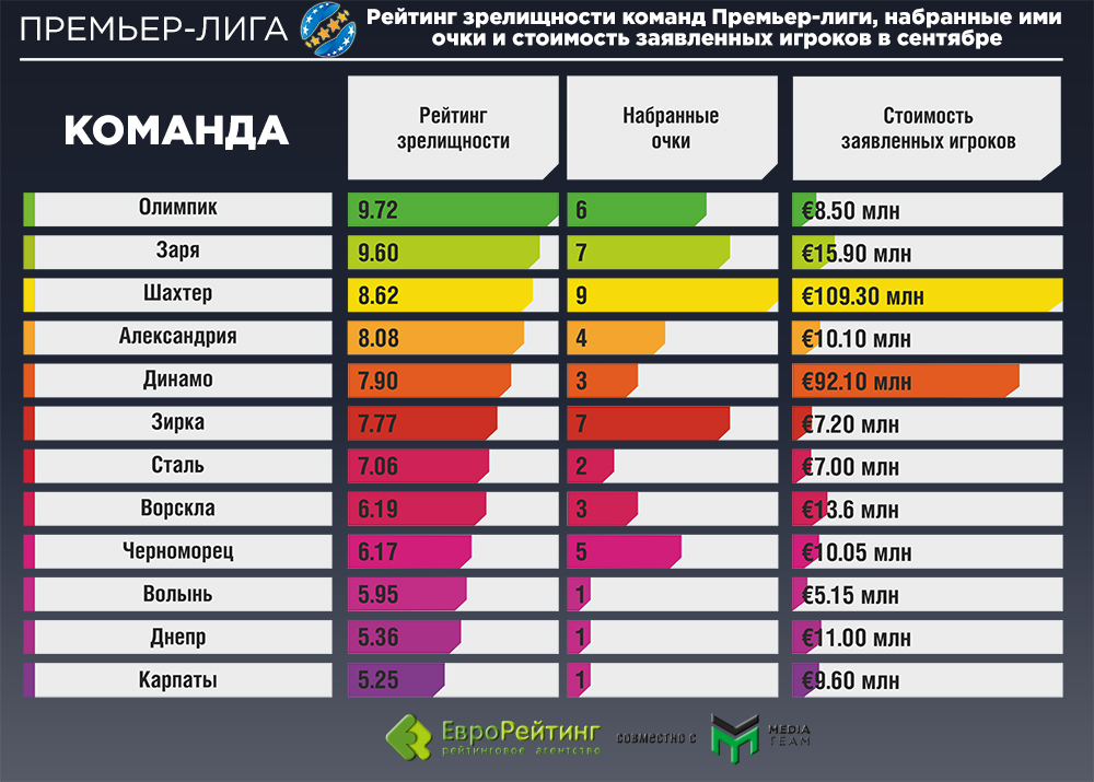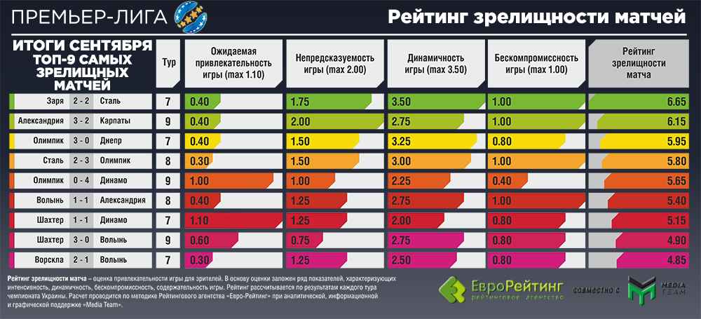 Игра какого клуба покоряла сердца зрителей в сентябре: Динамо?, Зари?, Шахтера? Нет! Донецкий Олимпик оказался лучшим в рейтинге зрелищности по итогам сентября. Высоких оценок качества игры по итогам 7 и 8 туров, когда был разгромлен Днепр, а затем безоговорочно побеждена Сталь оказалось достаточно, чтобы удержать первое место. Даже низкий балл за игру с Динамо в 9 туре, не подвинул Олимпик с его Олимпа.