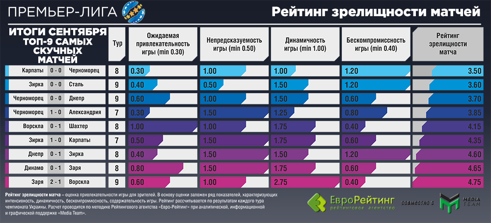 Качество игры киевлян огорчило всех поклонников клуба в сентябре. Вместе со зрелищной игрой пропал и результат. Евро-Рейтинг, подводя итоги августа , указывал на вероятное ухудшение в игре команды: уже тогда результаты зрелищности снижались. Прогноз подтвердился очень быстро, что говорит о прямой взаимосвязи снижение зрелищности Динамо и последующего результата.