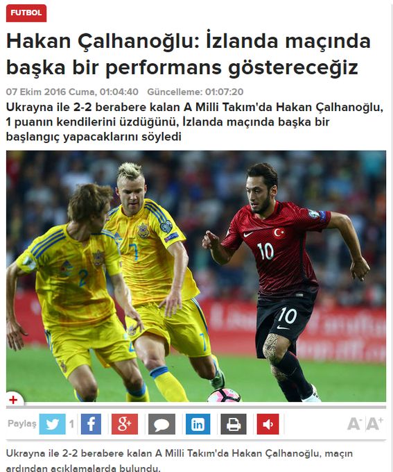Спортивный сайт haberturk.com опубликовал интервью с Хаканом Чалханоглу, который отметил, что, в целом, сборная Турции больше заслужила победу. «В конце матча движение у нас было лучше, чем у соперника. Думаю, и играли мы тоже лучше. Но, к сожалению, не смогли реализовать все наши шансы», - сказал Чалханоглу.