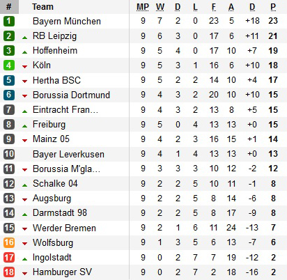 После 9-го тура чемпионата Германии лишь три команды продолжают идти без поражений. И если в случае с «Баварией» такой результат не выглядит удивительным, то результаты «Лейпцига» и «Хоффенхайма» по меньшей мере сенсационные. Более того, «Ред Булл» является чуть ли не единственным соперником команды Карло Анчелотти в борьбе за «серебряную салатницу». «Хоффенхайм» же после стартовых матчей из 4-х ничьих кряду выдал серию из 5-ти побед, поднявшись на высокое для себя третье место. А где же фавориты? А фавориты пытаются бодаться друг с другом в середине турнирной таблицы и пока не помышляют даже о чем-то более высоком.