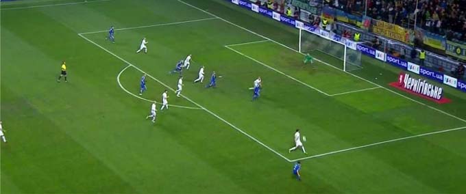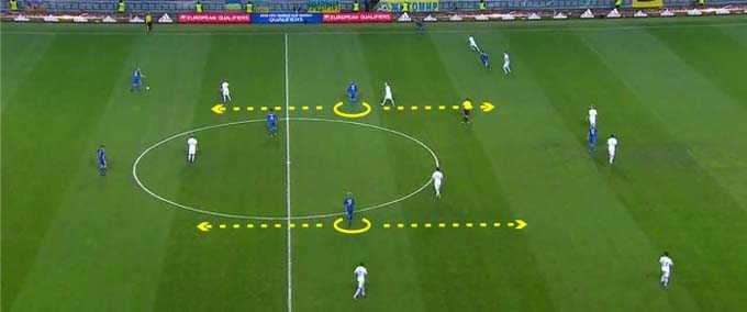 Здесь же следует выделить особую роль, которая в реализации тактических решений недавнего «динамовца» Рауля, отводится Коваленко и Зинченко. Оба футболиста не играют чистого разыгрывающего «под нападающим», а много перемещаются в полусредних зонах по высоте, открываясь под получение мяча. Такой последовательный выход в атаку с подключением игроков центра поля ранее фланговых нападающих значительно упрощает контроль мяча в атаке и придает комбинациям большее разнообразие. Теперь для нейтрализации атак Украины сопернику недостаточно перекрывать фланговые зоны, чем сегодня страдает, например, киевское «Динамо».