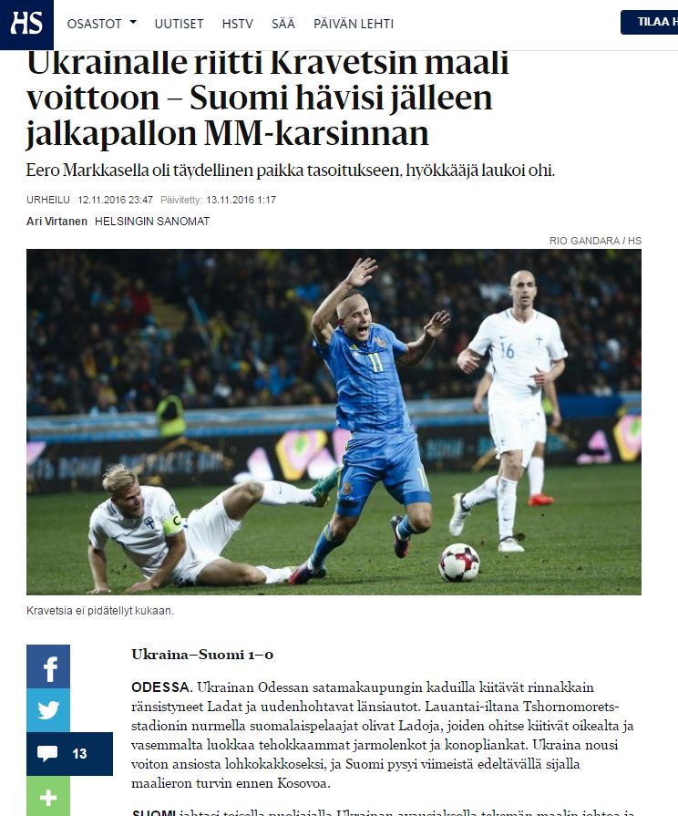Обзор прессы страны Суоми после матча Украина – Финляндия