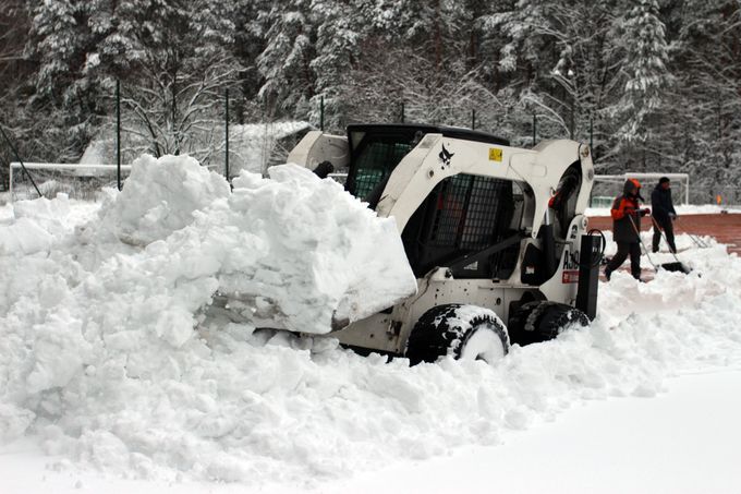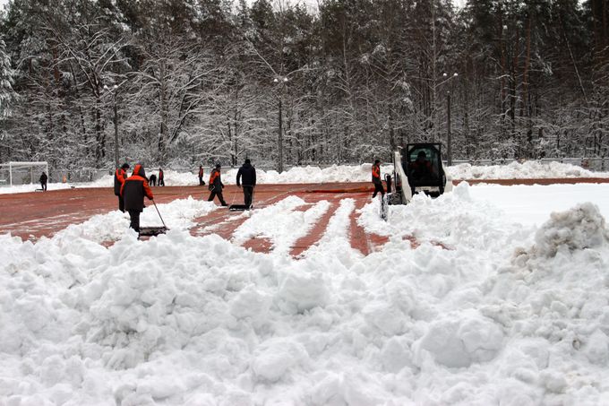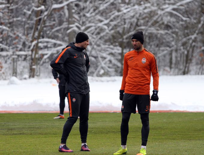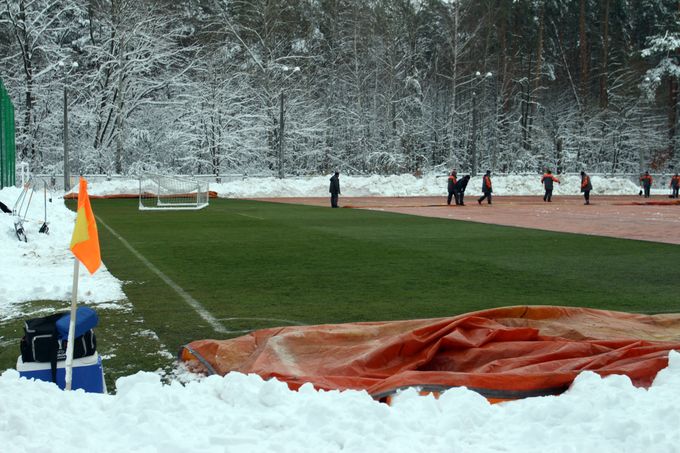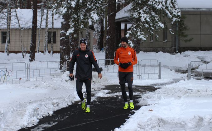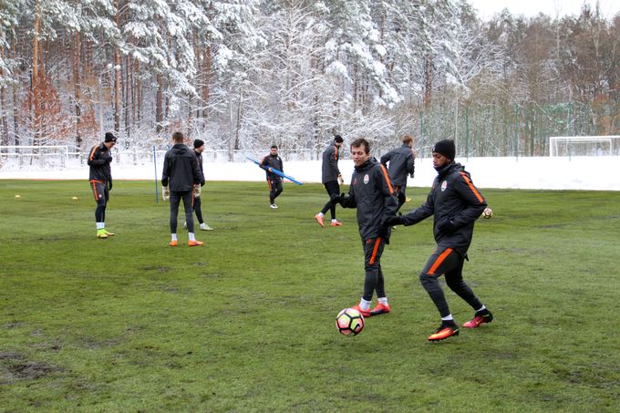 После воскресного снегопада, продолжавшегося до cамого утра понедельника, тренировочное поле базы «Святошино» было полностью укрыто снеговым покровом. Защитная пленка, заблаговременно уложенная клубными агрономами, помогла сохранить газон к тренировке в сносном как для погодных условий состоянии. Расчистить же поле от снега оказалось не такой уж простой задачей: пока игроки «Шахтера» занимались фитнесом в зале, работники базы с помощью снегоуборочной машины около часа расчищали газон от снежного покрова. Причем расчистили только половину поля – вторую, видимо, решили поберечь для следующего занятия.