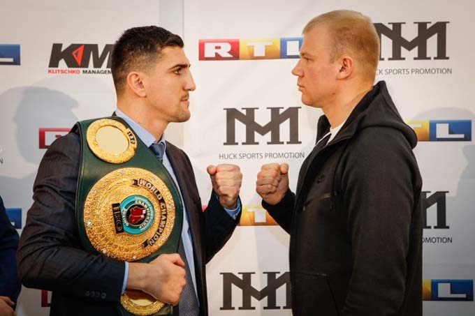 Чемпион мира по версии IBO в первом тяжелом весе немецкий боксер Марко Хук и его будущий соперник украинец Дмитрий Кучер после финальной пресс-конференции в Ганновере сошлись в традиционной дуэли взглядов: