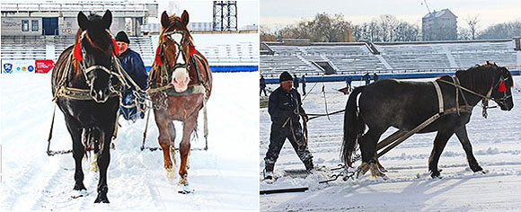 ФОТО ДНЯ:Уборка снега на стадионе в Ивано-Франковске с помощью лошадей