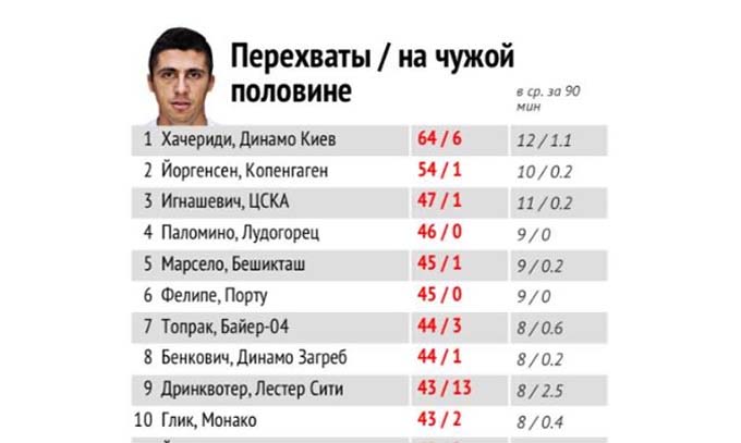 Евгений Хачериди – лидер по перехватам мяча в Лиге чемпионов. Игрок киевского «Динамо» с огромным отрывом лидирует по этому показателю в главном клубном турнире Европы.
