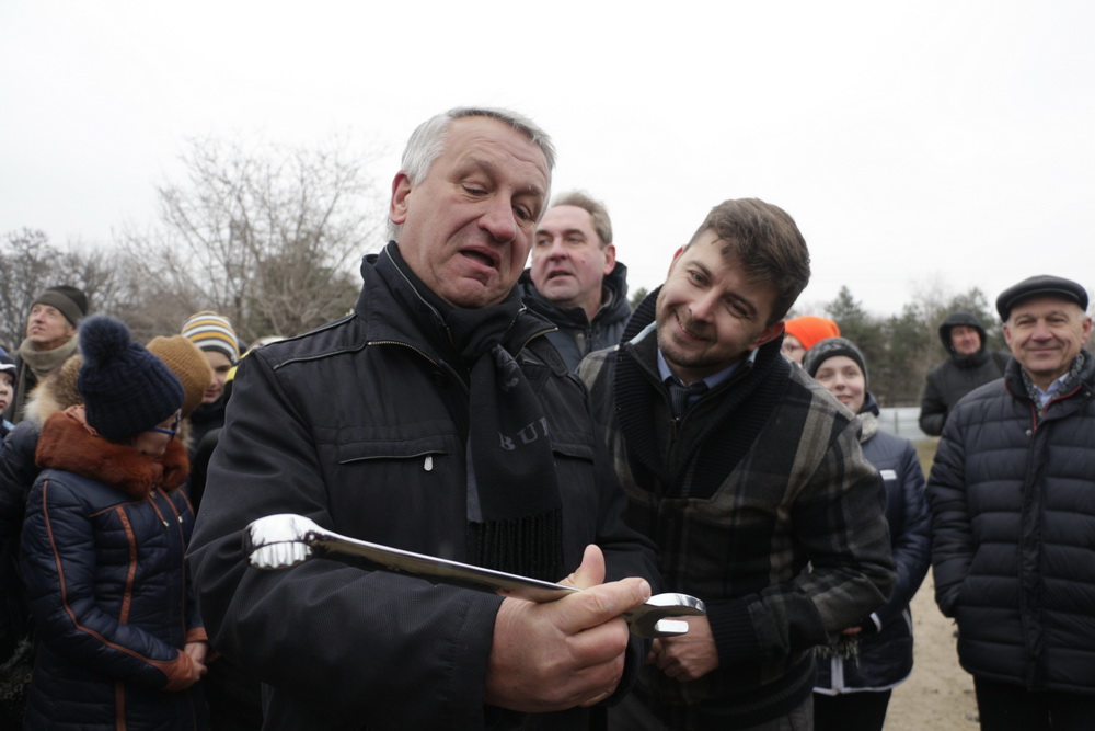 Гости мероприятия торжественно заложили первую часть конструкции будущего стадиона.
