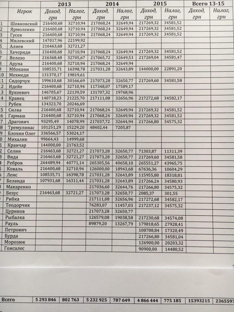 Согласно этому документу, «Динамо», якобы, платит каждому футболисту около 200 тысяч гривен в год. Таким образом, за три года – с 2013 по 2016-й – киевский клуб выплатил своим игрокам 15,4 миллионов гривен официальной зарплаты, из которых в государственный бюджет поступило 2,3 миллиона гривен налогов.