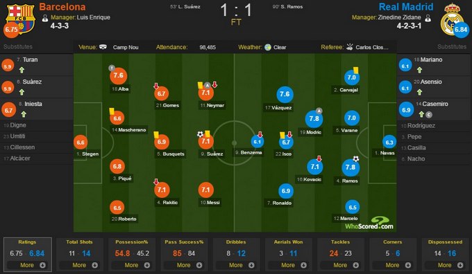 Единственный футболист, который 90 минут отыграл на идеальном уровне – это Лука Модрич. Точность передач хорвата в «эль класико» — 95,2%. Кроме того, не в последнюю очередь, благодаря его действиям практически удалось нейтрализовать Месси. Аргентинец за весь матч нанес только два удара по воротам. Таким образом, Лионель Месси не смог забить мадридцам в шестом матче подряд. Безголевая серия аргентинца в «эль класико» уже превысила 8 часов — она насчитывает 490 минут.