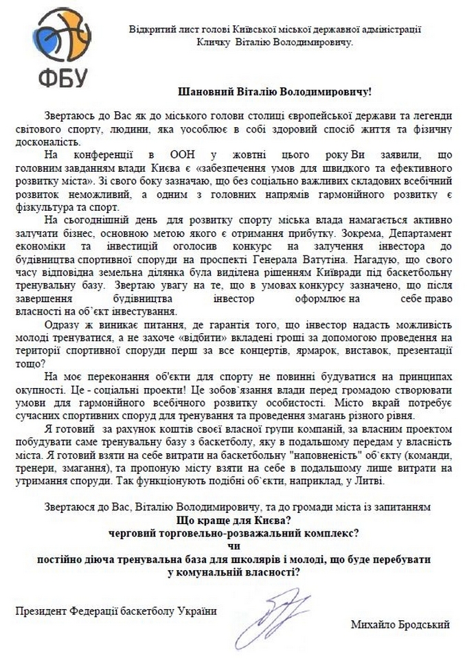 Президент ФБУ Михайло Бродський звернувся до міського голови Києва Віталія Кличка та громади. У відповідь на оголошення конкурсу з залучення інвестора для будівництва спортивної споруди на проспекті Генерала Ватутіна.