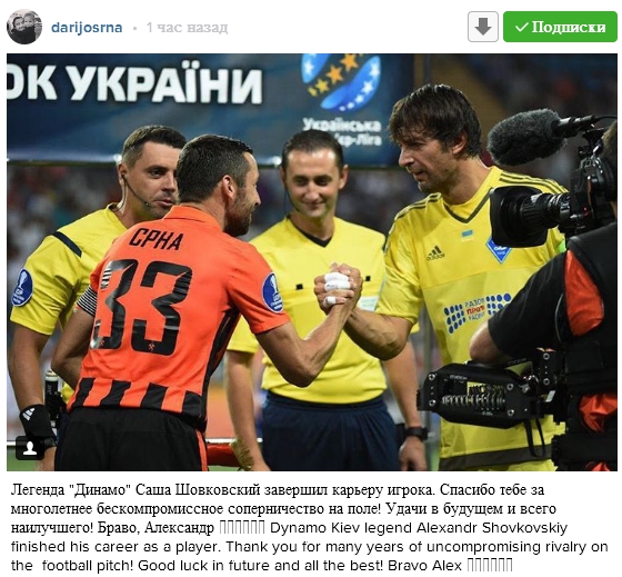 Капитан «Шахтера» Дарио Срна поблагодарил легенду «Динамо» Александра Шовковского за соперничество на поле и пожелал удачи теперь уже бывшему игроку в дальнейшем.