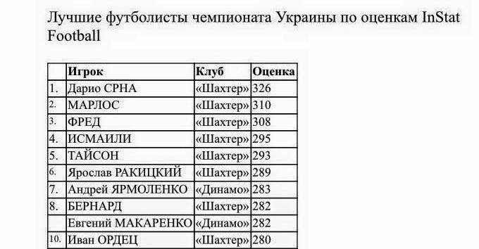 В списке из десяти лучших футболистов чемпионата Украины восемь представляют донецкий «Шахтер»