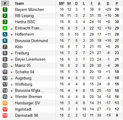Ни «Герта», ни «Айнтрахт» в этом сезоне не прыгнут выше своей головы и во второй части сезона наверняка вернуться на свои места в турнирной таблице. Мы же отметим «Хоффенхайм», который сумел предстать перед своей публикой в лике беспроигрышного коллектива, доведя свою серию в этом сезоне до 16-ти матчей. Имеет шансы вернуться в борьбу за еврокубки и «Байер», однако и этому клубу время подумать о смене наставника, ведь Роджер Шмидт уже давно не показывает того результата, который от него требуют.