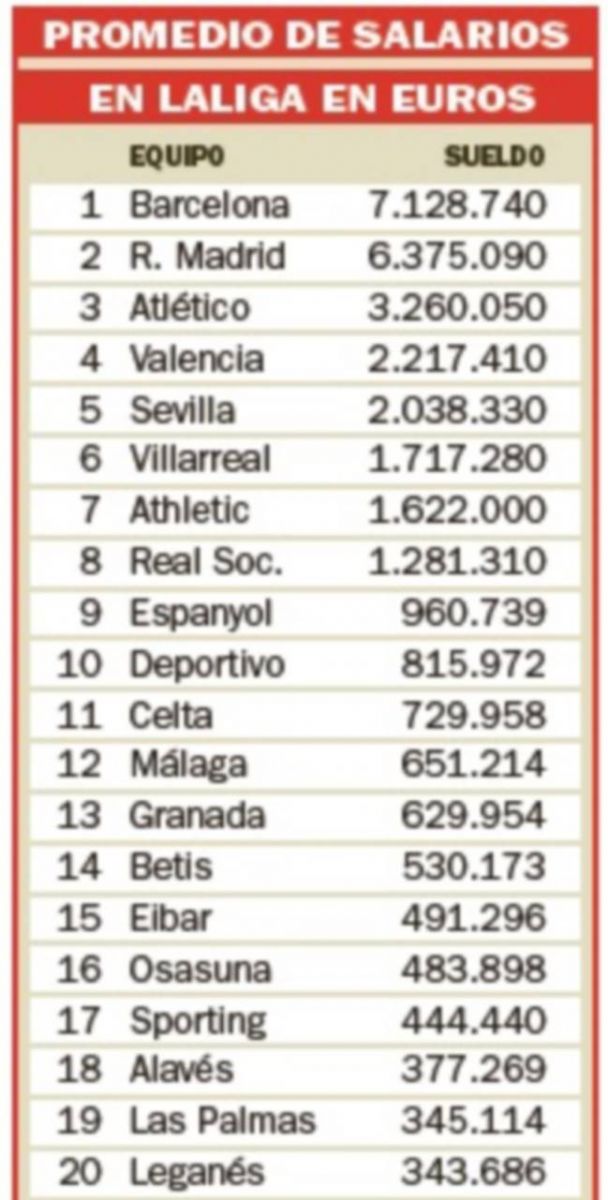 Среди команд высшего дивизиона испанского футбола самая высокая средння зарплата - в «Барселоне»: более 7 млн евро. В «Реале» футболистам платят чуть меньше: