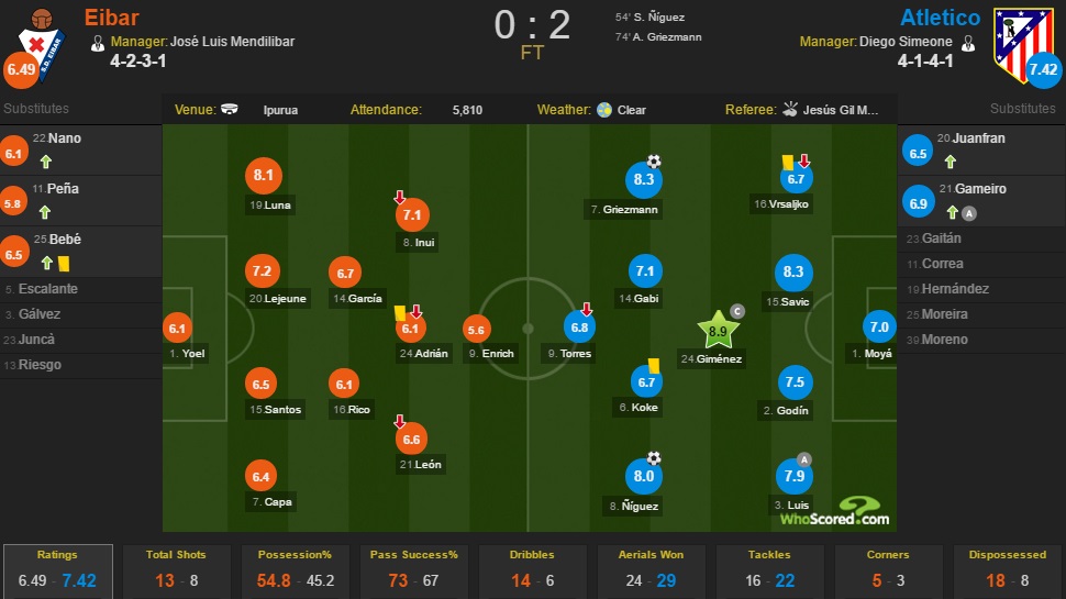После этого затягивание времени только продолжилось, «Атлетико» почти не атаковал и не давал проводить атаки сопернику. По итогу, мадридцы сумели победить на выезде с уверенным счетом, который не совсем отображает происходящее на поле. Благодаря этой победе, «Атлетико» взбирается на четвертое место Примеры, но с такой игрой, как в матче против «Эйбара», говорить о каких-либо чемпионских амбициях «индейцев» нет смысла.