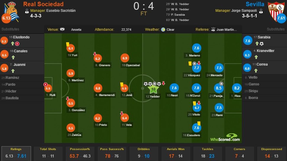 «Севилья» уверенно побеждает на «Аноэте», «Сосьедад» проваливает матч, помогая андалусийцам взобраться на второе место турнирной таблицы.