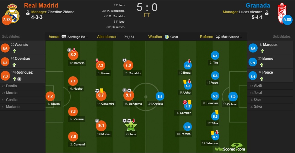 Зато мадридцы куражились, как могли. Уже на 12-й минуте Иско отправил первый мяч в ворота Очоа, воспользовавшись фатальной игрой защитников «Гранады». Статистический портал WhoScored из всех защитников «Гранады», одного лишь Тито «наградил» оценкой выше 6 (по десятибалльной шкале). Кстати, самую высокую оценку из полевых игроков в матче в стане «Гранады» получил Артем Кравец – WhoScored поставил украинцу 6,4. Выше только у Очоа, который, несмотря на пять пропущенных мячей, провел неплохой матч, сделав восемь сейвов.