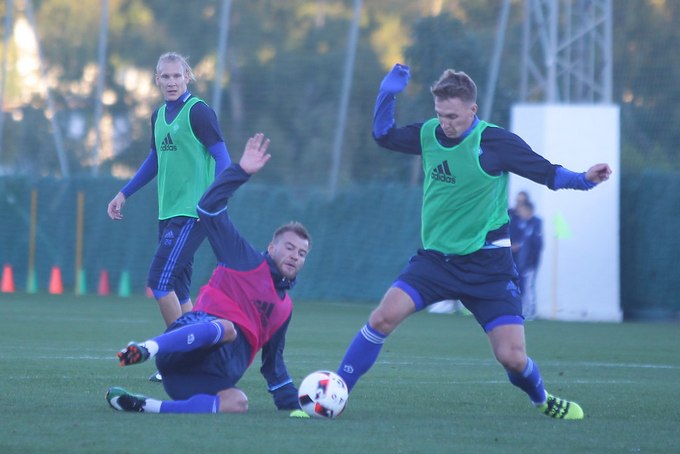 Вечернее занятие было полностью игровым. После разминки игроки были поделены на группы и играли в квадратах, после чего они под руководством тренерского штаба отрабатывали атаки, действия в защите и нападении отдельно на каждой половине поля.