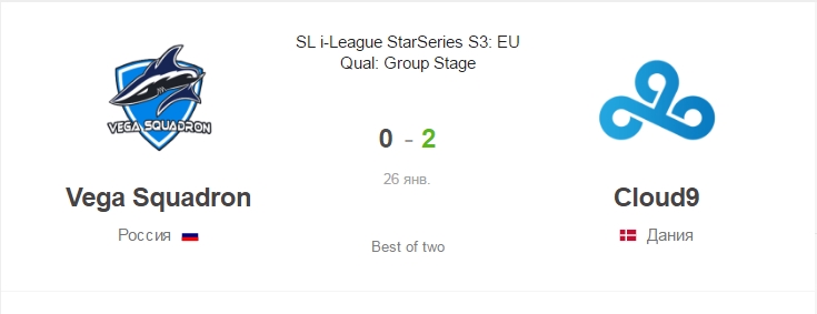Игровой день стартовал с противостояния Vega Squadron и Cloud 9. Обе карты «акулы» провели крайне неудачно — датчане овладевали преимущество со старта игры и не давали раскрыться героям соперника. В первом раунде серии Vega сдалась на 20 минуте, а во втором протянула на 10 минут больше.