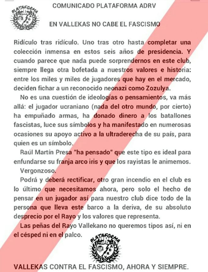 Ультрас «Райо Вальекано» предупредили президента клуба Рауля Мартина Пресу, что выступают против трансфера украинского полузащитника Романа Зозули из «Бетиса», поскольку не разделяют его политические взгляды.
