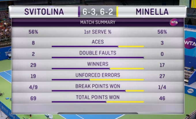 В полуфинале спортсменка в двух сетах взяла верх над Мэнди Минеллой из Люксембурга: 6/3, 6/2.