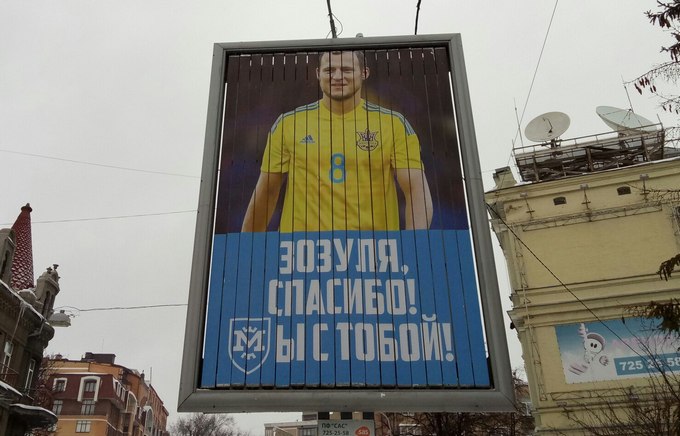 В центре Харькова появился щит с изображением форварда «Бетиса» Романа Зозули в форме сборной Украины и текстом «Зозуля, спасибо! Мы с тобой!»