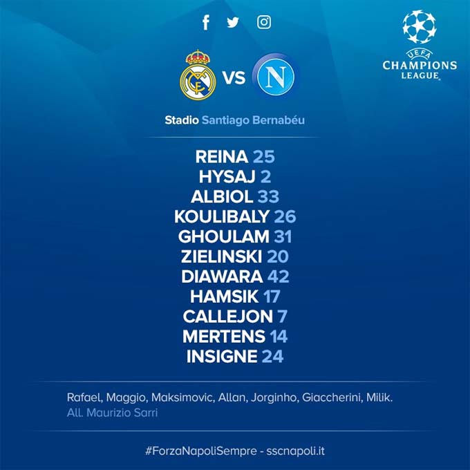 «Наполи»: Рейна – Хюсай, Кальехон, Мертенс, Гамшик, Зелиньски, Инсинье, Кулибали, Гулям, Альбиоль, Диавара