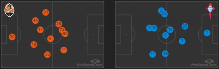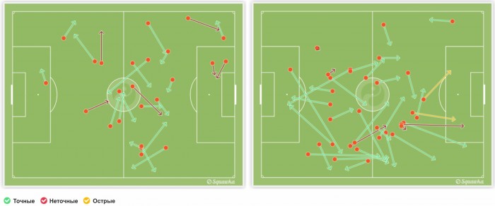 Однако в качестве действий в атаке со своей стороны прибавили и гости. Как следует из диаграммы усредненных позиций игроков, «Сельте» удалось сохранить территориальное преимущество. Большее число средних и коротких передач (628 против 501 по данным Opta) говорит и о том, что за гостями осталась и инициатива в позиционном компоненте игры. Кроме того, по сравнению с первой игрой, испанской команде удалось заметно повысить эффективность действий в завершении – вместо одного удара в створ из 9 неделю назад, испанцы били 15 раз, и попали в ворота в половине случаев.