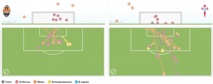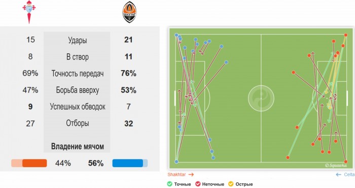 Другое дело, что в части реализации достаточного числа созданных моментов игроки «Шахтера» проявили себя не лучшим образом. По данным Opta, все 100% (!) своих ударов хозяева нанесли из пределов штрафной «Сельты». 21 удар по воротам соперника при 11 в створ – показатель, которого даже в чемпионате Украины с куда более податливыми соперниками «Шахтер» добивается не всегда. Значит, цель в доставке мяча в эту зону была достигнута и тактический план Фонсеки на игру сработал.