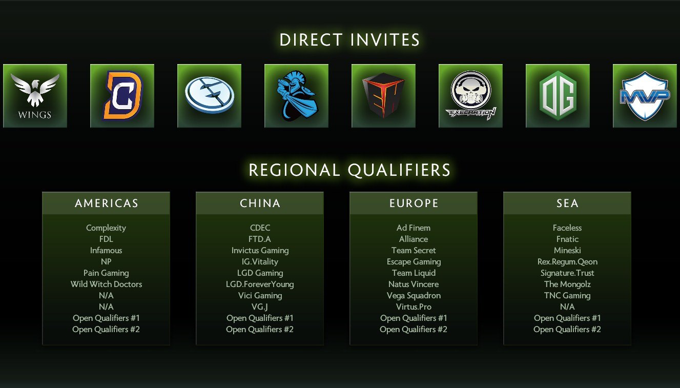 Если говорить опять-таки о шести «инвайтах», то наиболее вероятно выглядят приглашения для действующих чемпионов мира – Wings Gaming, которые займут слот китайского региона. Открытым вопросом остается лишь, кто получит путевку из SEA региона? Кажется его разыграют между Team Faceless или TNC. Первые всех удивили своим выступлением на Dota Pit, а TnC Pro Gaming взяли первое место на WESG и 3-4 в StarLadder, что в принципе дает им преимущество над «безликими».