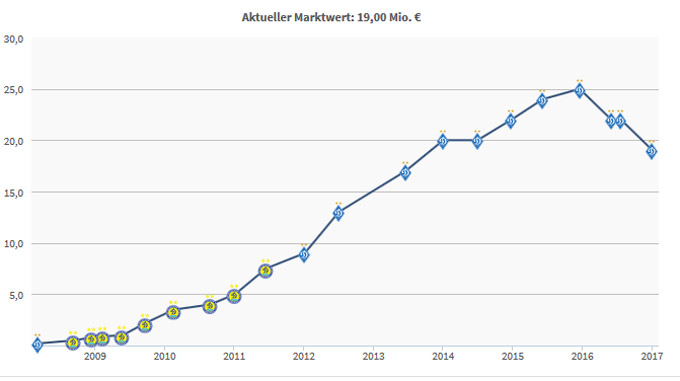 Стоимость трансфера Андрея Ярмоленко со времени последнего обновления (январь 2017) осталась прежней и составляет 19 миллионов евро.