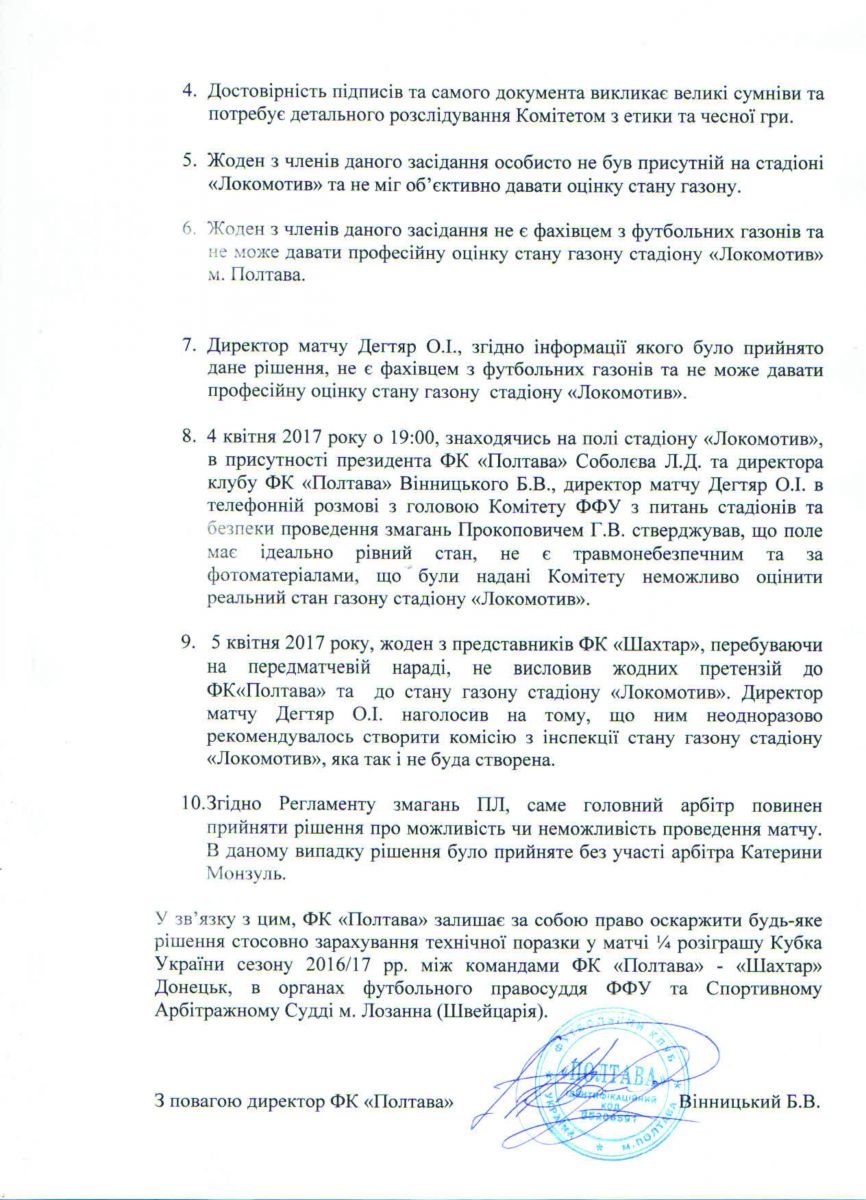 Футбольний клуб «Полтава» вклався у 24-годинний термін подачі протестів на матчі, і направив відповідні документи з приводу кубкової гри із «Шахтарем» до ПФЛ, УПЛ, ФФУ, а також УЄФА і навіть ФІФА.