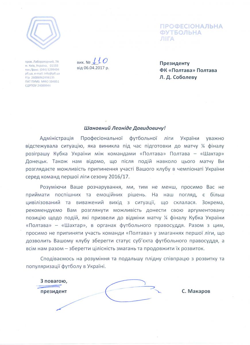 В связи с получением письма № 110, подписанного президентом ПФЛ Украины - Макаровым С.Д., а также с решительной позицией клуба в отстаивании свои прав в органах футбольного правосудия ФФУ, а в случае необходимости в Спортивном Арбитражном Суде (г. Лозанна, Швейцария), руководство футбольного клуба «Полтава» приняло решение о продолжении участии команды в соревнованиях под эгидой ПФЛ Украины.