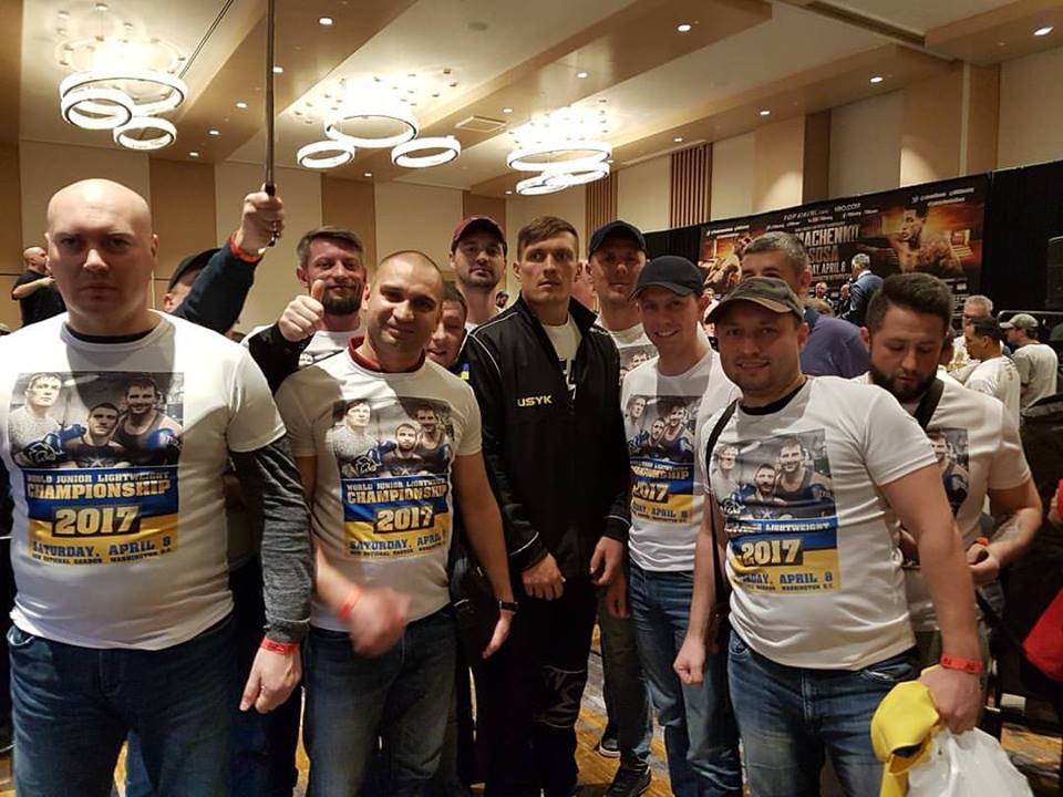 Сегодня Усик, Гвоздик и Ломаченко не останутся без поддержки соотечественников. По нашей информации, Александров и Василия на арене будут поддерживать около 300 украинцев. Основная часть из них – это наши соотечественники, которые живут и работают в США. Но около 50 фанов бокса специально прилетели в США из Украины поддержать наших чемпионов. Причем компания во главе с Алексеем Зиневичем (на фото крайний справа) специально под этот боксерский вечер пошила себе футболки-постеры. На них изображены Усик, Гвоздик и Ломаченко, а на сине-желтом фоне дата проведения боксерского вечера. На взвешивании перед боем Александр Усик оценил усилия ребят и с видимым удовольствием фотографировался с ними.