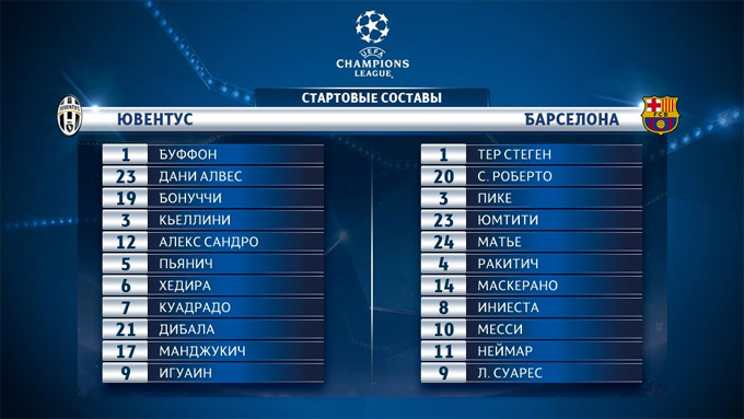 «Ювентус»: Буффон (В)(К), Кьеллини, Пьянич, Хедира, Куадрадо, Игуаин, Алекс Сандро, Манджукич, Бонуччи, Дибала, Дани Алвес