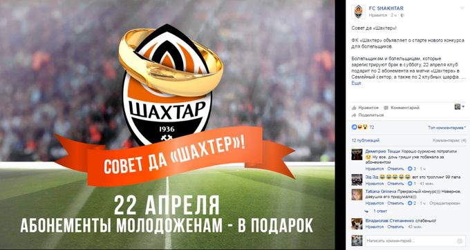 ФК «Шахтер» разместил на страницах в социальных сетях анонс акции – горняки подарят всем молодоженам, которые зарегистрируют брак 22 апреля, абонементы на матчи и клубные шарфы.