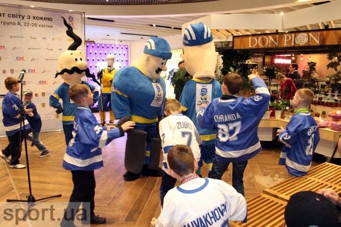 Наибольшей активностью отличились юные хоккеисты, которые пришли посмотреть на своих старших коллег, а также поиграть с талисманами будущего чемпионата мира.